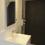 Unser modernes Badezimmer in Travemündes Ferienwohnung liegt zentral und gilt als Erholungsraum. Das luxuriöse Badezimmer ist mit einer Regedusche ausgestattet und verwöhnt Sie mit weiteren Düsen – genau das Richtige nach einem aufregenden Tag in Travemünde. Neben den hochwertigen Grohe Elementen und der edlen Steinoptik bei der Dusche ist der LED-Spiegel ein echter Hingucker, denn das Licht reagiert über Handsensoren und verfügt über ein eingebautes Radio. Das ganze Konzept des Badezimmers ist nach ökonomischen Gesichtspunkten aufgesetzt, sodass die Therme äußerst energieeffizient arbeitet – kurzum: ein echtes Erholungsparadies.